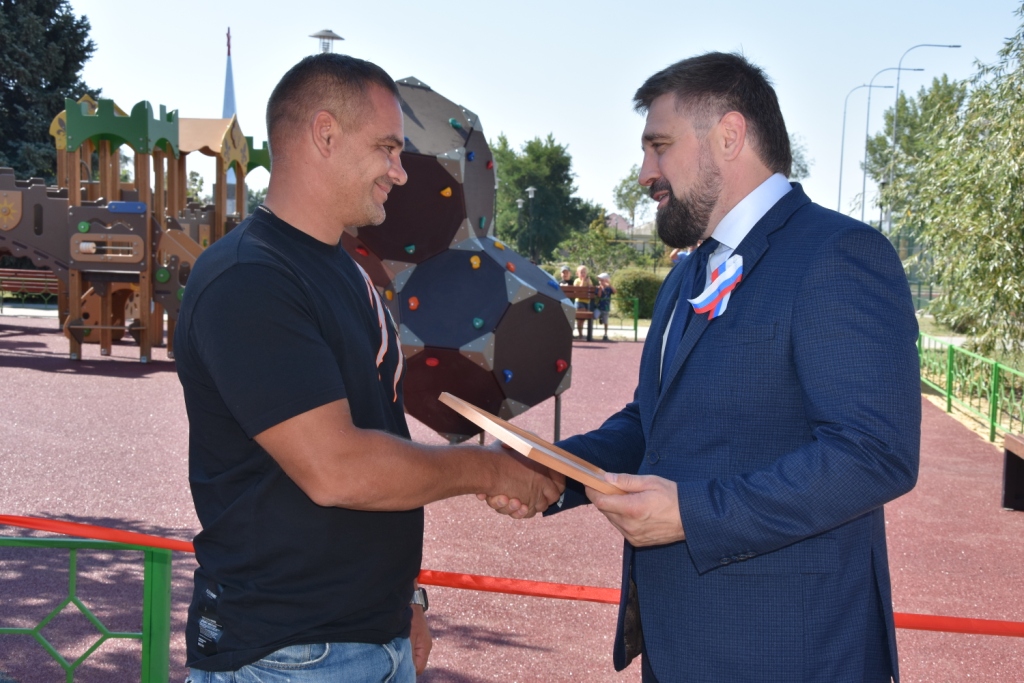 Владимир Анатольевич тепло поздравил всех со знаменательным событием и выразил уверенность, что новая удобная площадка станет местом активного отдыха для детей разного возраста, а взрослые могут быть уверены в ее безопасности, поскольку построена она с соблюдением всех требований и норм. Также Владимир Анатольевич поблагодарил руководителя подрядной организации «Альянс Групп Строй» (Подмосковье) за качественно выполненную работу с опережением установленных сроков и вручил благодарность. Слова поздравления прозвучали и от главы Глубокинского поселения Ольги Бородачевой.