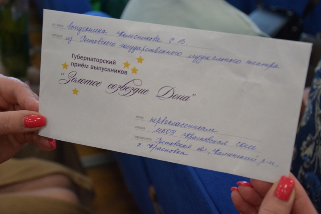Представителям Красновской школы она передала письмо для первоклассников от выпускницы С. Колесниковой из Ростовского государственного музыкального театра.