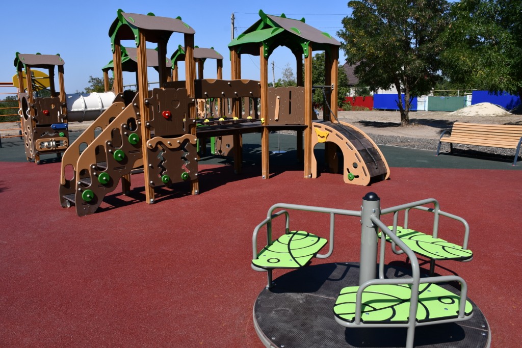После этого ребята начали тестировать площадку, а она получилась суперкрасивой и наполненной. В центре — игровой комплекс из горок, лестниц и переходов, рядом качели, карусели и машинка на пружинах для самых маленьких. Для подростков на площадке установили комплекс из турников, шведской лестницы и колец, чуть поодаль — качели. Основание площадки бетонное, а покрытие из амортизирующей резиновой крошки. Легко бегать и спрыгивать с высоты. По периметру установлены удобные лавочки со спинкой. В общем, каждая деталь продумана.