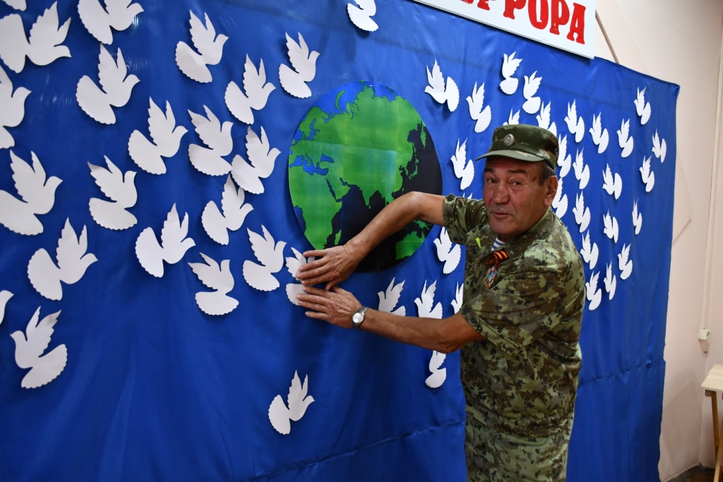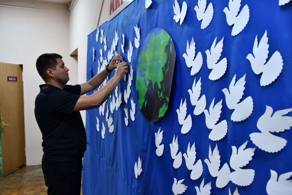 Перед началом мероприятия в фойе прошла акция «Мир без террора», где каждый участник мог прикрепить на импровизированное небо символ мира —белых голубей.
