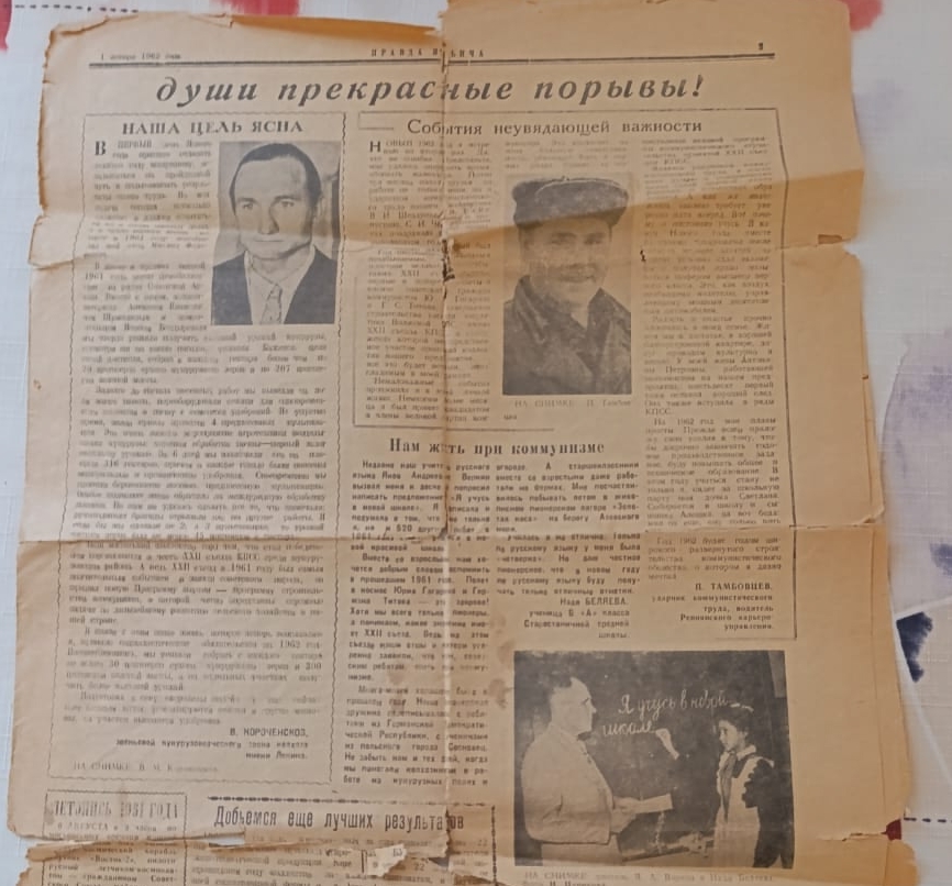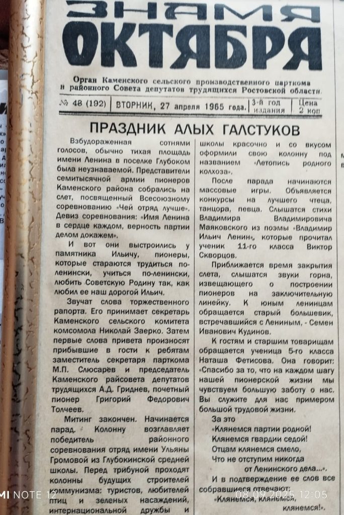 И, конечно, для меня стало приятным сюрпризом, когда коллеги подарили мне на юбилей альбом с газетными вырезками – все в нем было упорядочено, систематизировано по годам. Отражены в этом альбоме 1990-е и 2000-е годы, а особенно трогателен апрельский выпуск газеты «Знамя Октября» за 27 апреля 1965 года. Словно машина времени, он переносит меня в тот день, когда я появилась на свет. Вот статья Л. Шевцова «Праздник алых галстуков»: «Взбудораженная сотнями голосов обычно тихая площадь имени Ленина в поселке Глубоком была неузнаваемой. Представители семитысячной армии пионеров Каменского района собрались на слет, посвященный Всесоюзному соревнованию «Чей отряд лучше?».
