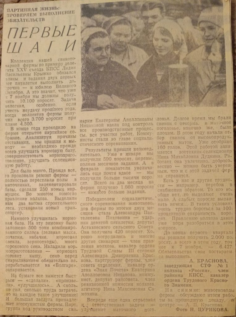 – В моем личном архиве много вырезок газеты «Знамя Октября» и «Земля». Я храню статьи о наших тружениках, ветеранах, событиях и мероприятиях, интересных людях. Например, вот эта статья времен Советских пятилеток, примерно 1976 года о работе свинотоварной фермы №1 колхоза «Россия». Автор – кавалер ордена Трудового Красного Знамени, заведующая фермой А. Краснова. В ней рассказывается о трудностях, о достижениях, о планах, о лучших работниках. Почему храню? Это мой родной колхоз, родные для меня люди. Статья – память о том, что и моя мама, Магдалина Андреевна Криушева, в те годы работала в животноводстве. А эта ферма – наше достояние, наша память, наша гордость: дважды коллектив занимал первые места во всесоюзном социалистическом соревновании! На ферме почти каждый третий работник был награжден государственными наградами. Все хуторяне – и дети, и взрослые – знали о работе СТФ и ее руководителе Александре Пантелеевне Красновой.