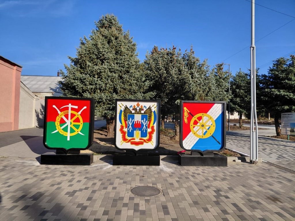 Ранее были изготовлены два герба – районный и поселения, но затем посчитали логичным добавить к ним герб Ростовской области. Его строители смонтировали в центре композиции. В итоге все три масштабных панно гармонично вписались в общий вид центральной площади.