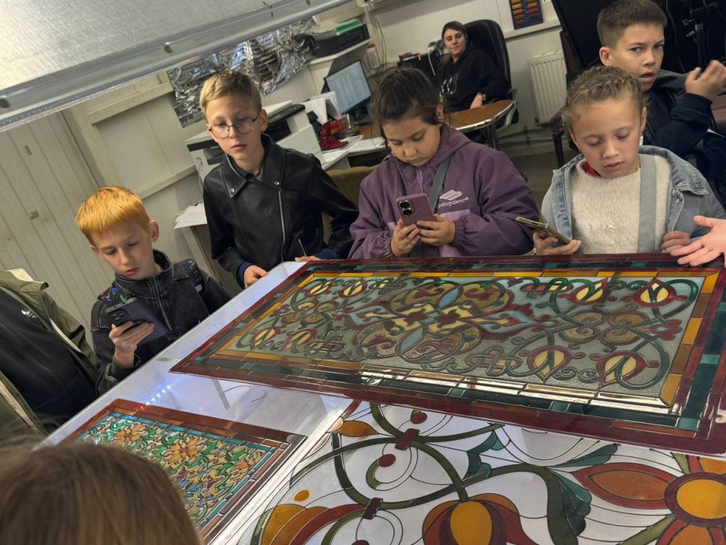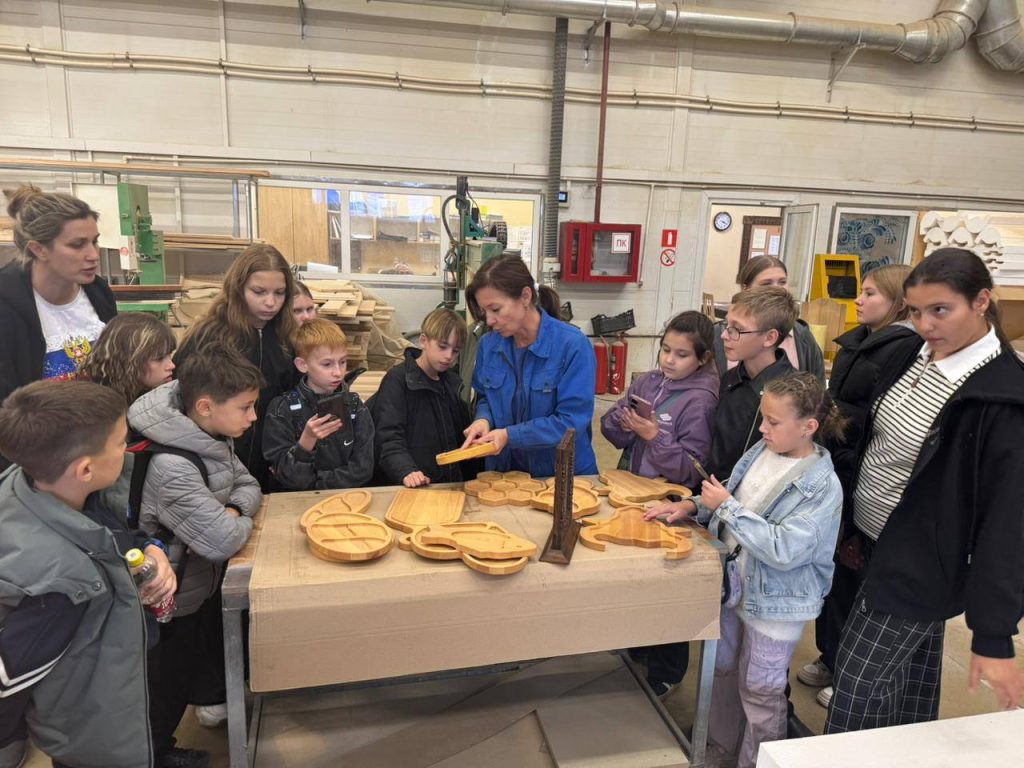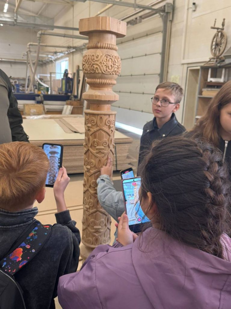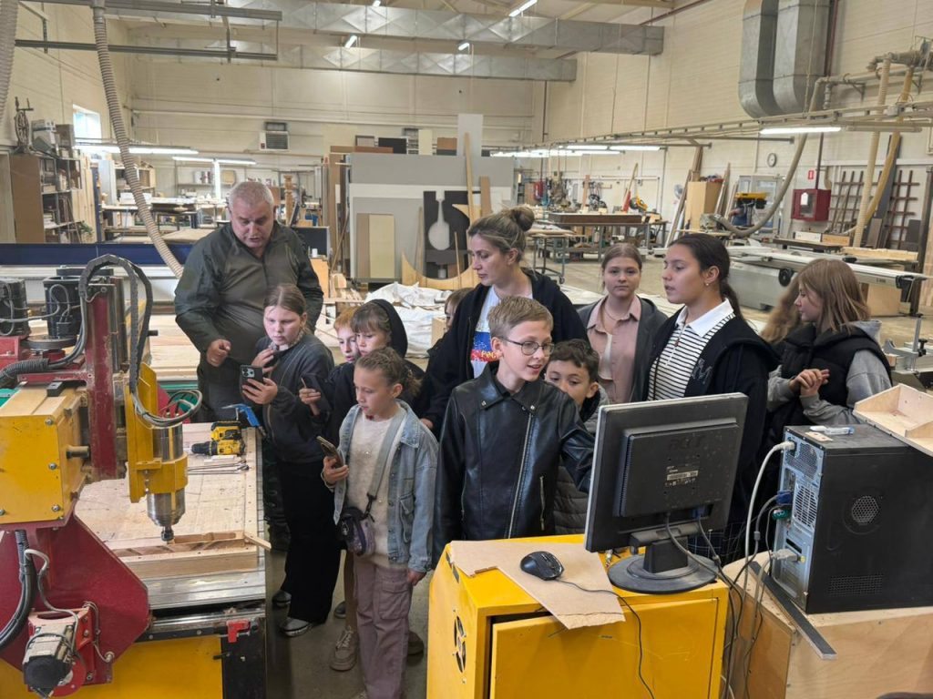 Алексей Николаевич подробно рассказал и показал, как работают станки с числовым программным управлением (ЧПУ), а также объяснил процесс выбора и обработки древесины, ее склеивания и шлифовки. Ребята также узнали о создании заливного витража — технологии декорирования стеклянных изделий с помощью цветных полимерных красок.