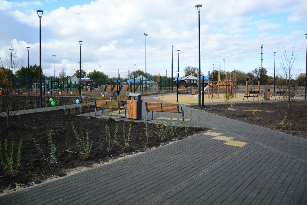 Все зоны в парке соединены между собой сетью дорожек, вымощенных тротуарной плиткой. Особо хочется отметить, что в процессе благоустройства большое внимание уделили озеленению. В парке высадили более 50 деревьев разных пород, более тысячи кустарников и столько же многолетних растений. То есть со временем все общественное пространство станет зеленым и тенистым местом.