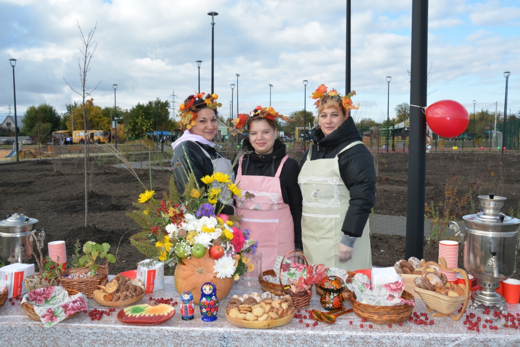 К открытию у сцены оформили фотозону в осенних тонах, а рядом развернули скатерть-самобранку – гостей угощали горячим чаем, пирожками и сладостями.