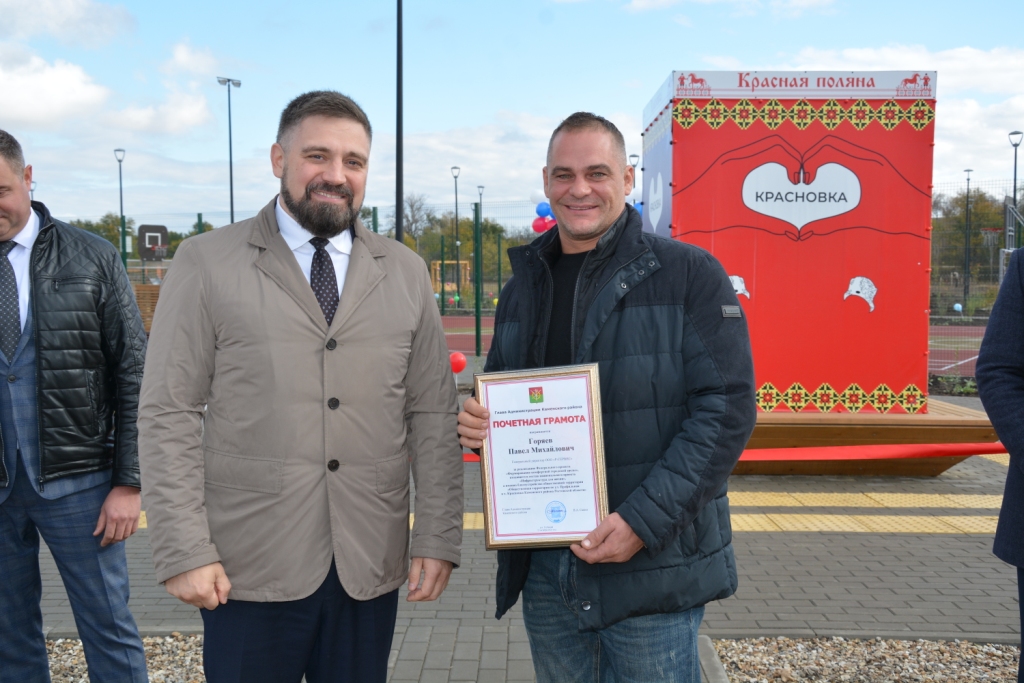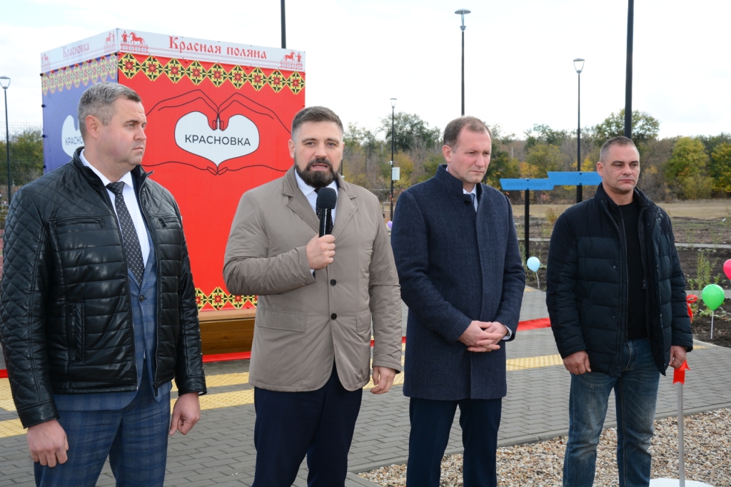 Дмитрий Беликов поздравил красновцев со значимым событием и подчеркнул, что руководство области уделяет большое внимание благоустройству населенных пунктов, реализуя в этом году более 300 подобных проектов в разных городах и районах. При этом учитываются мнение и пожелания жителей, интересы не только детей и молодежи, но и представителей старшего поколения. Жителей хутора поздравил глава администрации района Владимир Савин. Владимир Анатольевич поблагодарил правительство области и губернатора за возможность благоустраивать поселки и хутора, а в данном случае построить и оборудовать место отдыха для хуторян. Отдельные слова благодарности он высказал в адрес подрядной организации ООО «Р-Сервис». Строительная фирма реализует не первый подобный объект в нашем районе и всегда выполняет работы качественно и досрочно. Владимир Анатольевич вручил благодарность представителю подрядной организации. Поздравления также прозвучали от главы администрации Красновского поселения Павла Газенко. Павел Иванович призвал земляков беречь и сохранять созданный для всех парк.