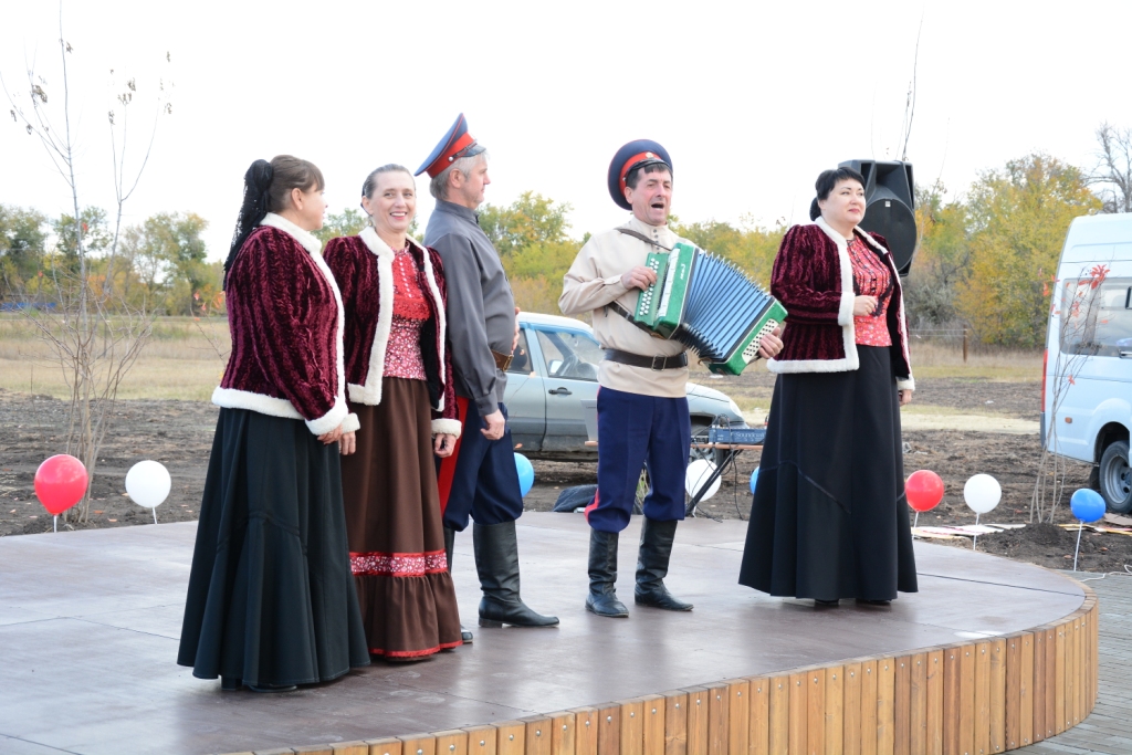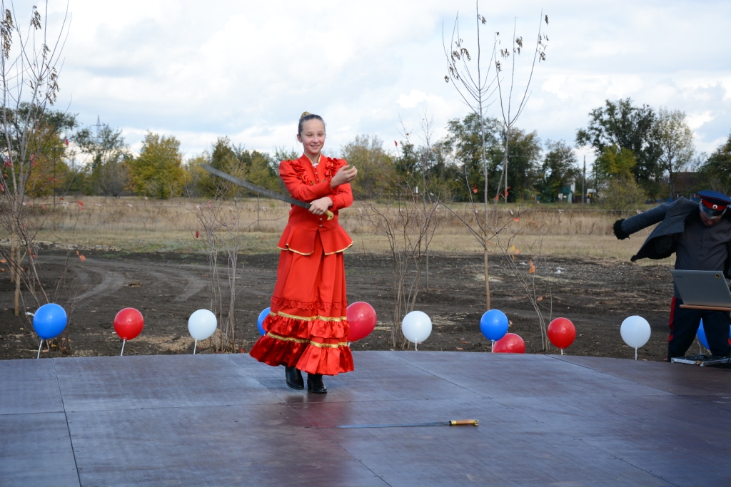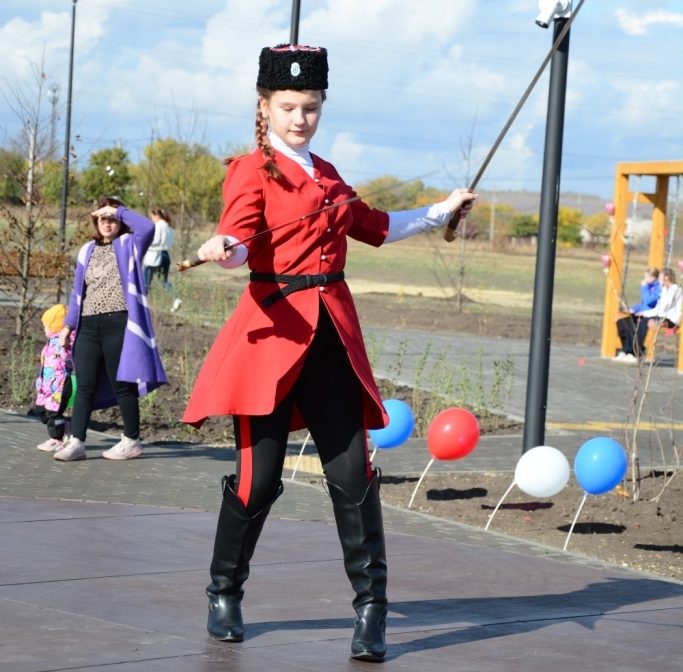 В двух участках парка расположились детские игровые зоны – для самых маленьких и для ребят постарше – с горками, канатами. Для безопасности обе засыпаны слоем песка. Самое романтичное место — лавочки-качели. Их тут же облюбовали девчата из «Движения первых». Еще одна замечательная зона — зрительный зал и сцена под открытым небом. Ее особо отметили работники культуры поселения, по секрету рассказав, что уже наметили здесь праздники в ближайшее время. А на открытии перед красновцами выступили фольклорный казачий коллектив «Беседа» и солисты РДК, а также воспитанницы КСК «Святая Русь» продемонстрировали мастерство фланкировки.