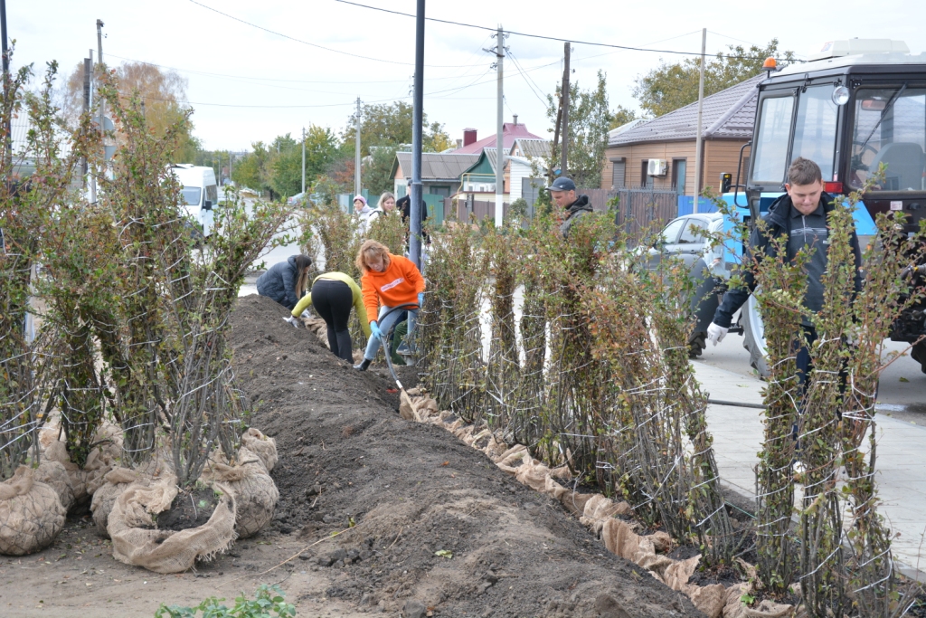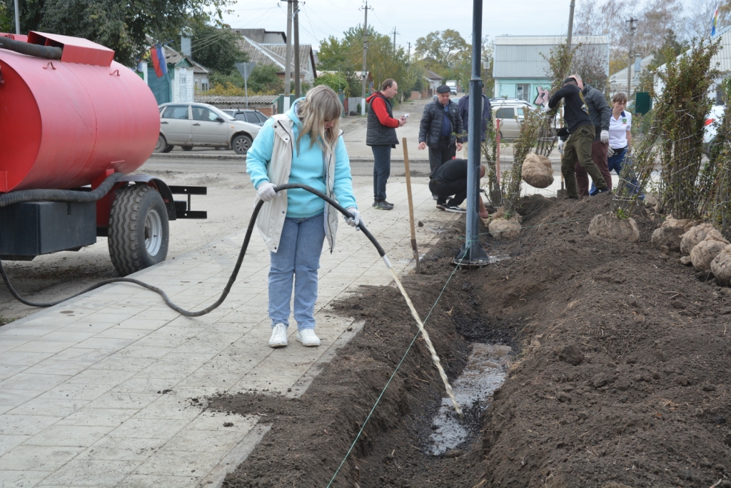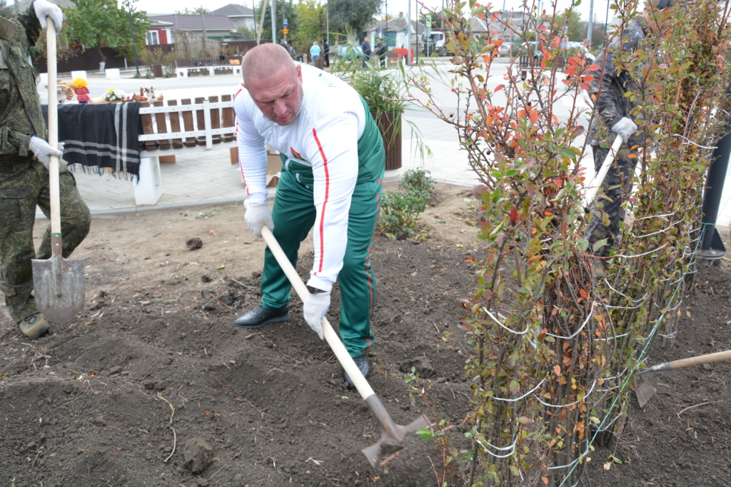 Главным зеленым акцентом этого дня стала высадка живой изгороди. Силами участников мероприятия на центральной площади было высажено более 200 саженцев кизильника блестящего. Этот неприхотливый и эффектный кустарник со временем, благодаря формирующей обрезке, превратится в плотную и аккуратную живую изгородь, которая станет украшением площади и хутора. Оставшиеся саженцы решено было высадить вокруг спортивной площадки, что сделает зону для занятий спортом еще более комфортной и привлекательной.
