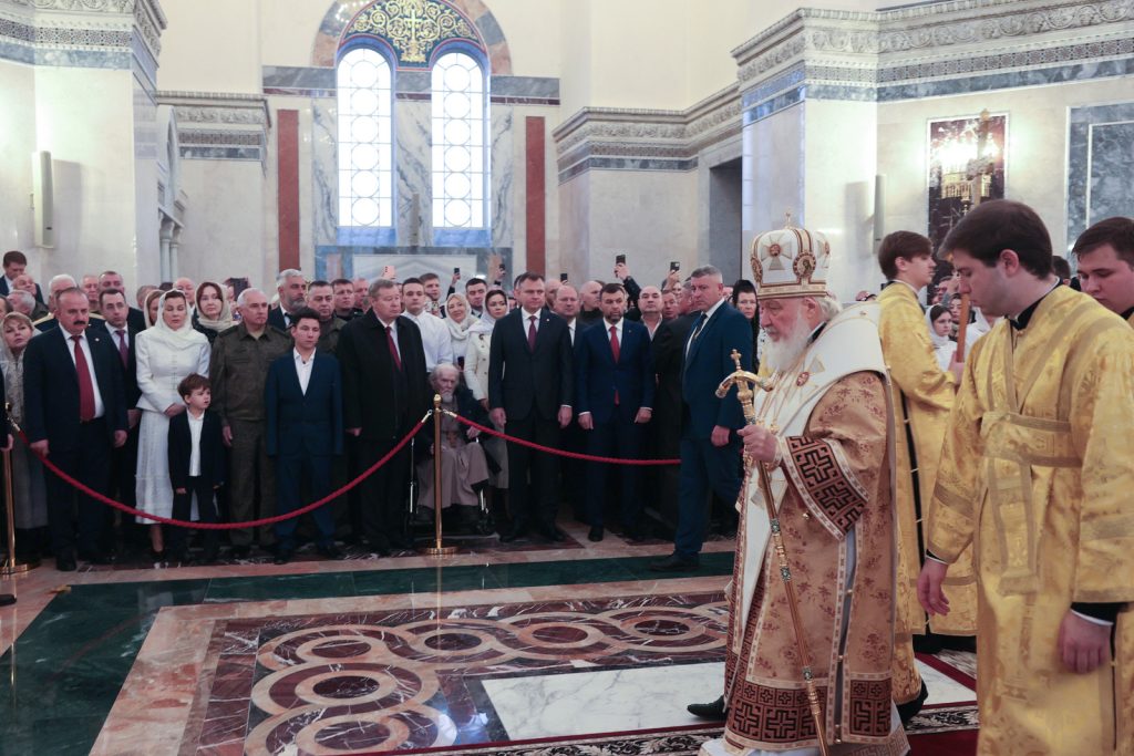 На богослужении также присутствовали военнослужащие Южного военного округа и кадеты. Патриарх Кирилл совершил Великий чин освящения главного воинского храма округа, сослужа с митрополитом Ростовским и Новочеркасским Меркурием и другими архипастырями.
