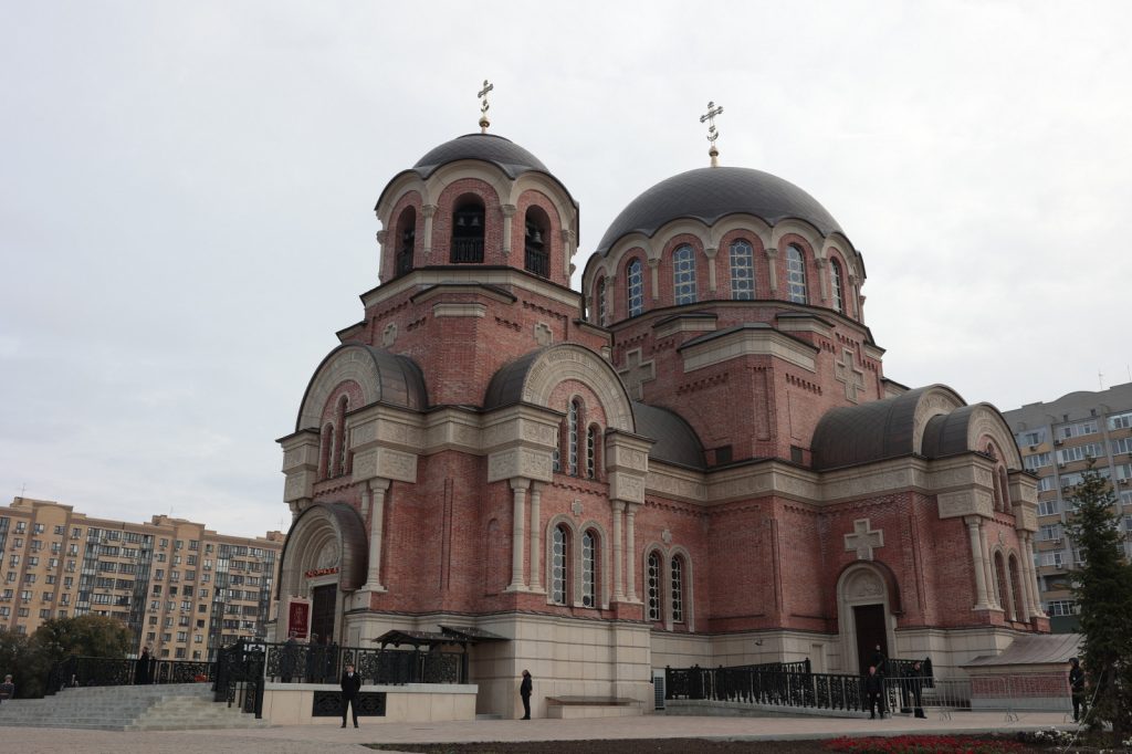 Строительство собора началось в 2012 году, а в 2021 году он получил статус главного православного воинского храма ЮВО. Храм Георгия Победоносца выполнен в византийском стиле, его высота достигает 40 метров, а диаметр купола составляет 18 метров. На куполе размещена мозаика с изображением восьми небесных архангелов. Вокруг храма разбит Георгиевский сад с озером, летним театром и детской площадкой, а также установлена стела святого Георгия Победоносца и высажена лавандовая Аллея Воинской Славы.