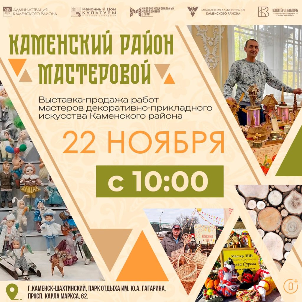 В Каменске-Шахтинском пройдет выставка-продажа работ районных мастеров декоративно-прикладного искусства «Каменский район-мастеровой». Мероприятие состоится 22 ноября с 10:00 в парке отдыха имени Ю.А. Гагарина по адресу: проспект Карла Маркса, 62.