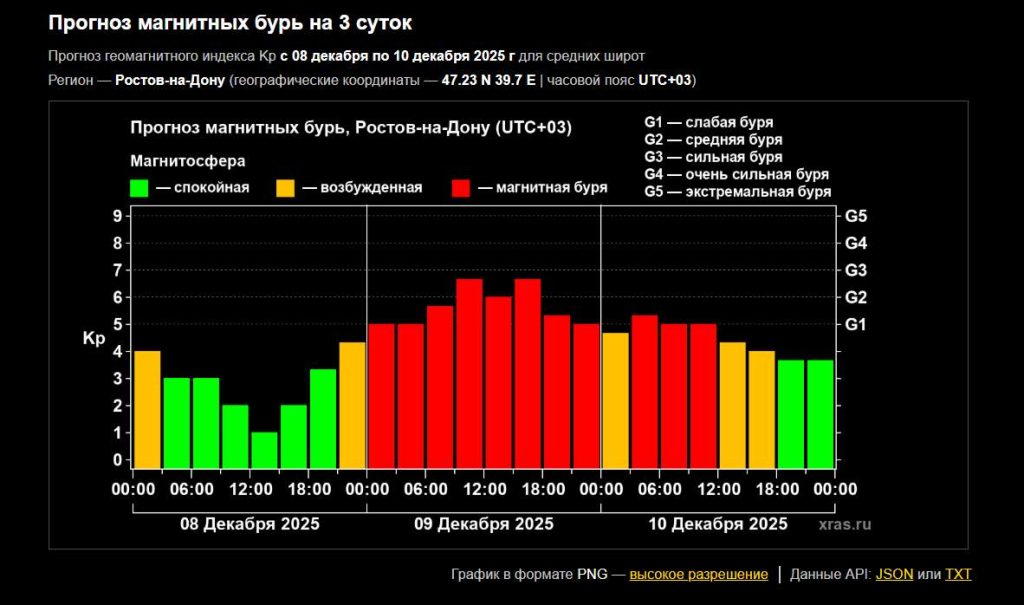 В ближайшее дни Землю накроет серия магнитных бурь. По прогнозам, 9 и 10 декабря ожидаются возмущения магнитосферы уровня от G2 до G3. Несмотря на умеренную силу вспышки, ее расположение точно на линии Солнце–Земля делает предстоящий удар практически фронтальным и максимально эффективным.