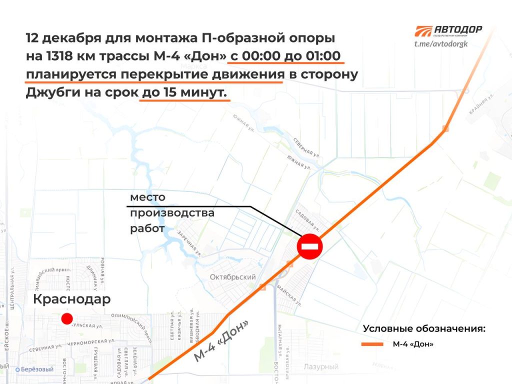На участке федеральной трассы М-4 «Дон» в Ростовской области в ночь на 12 декабря запланированы ремонтные работы, которые потребуют кратковременной остановки движения. Это связано с необходимостью восстановления опоры дорожного указателя. Об этом сообщает пресс-служба ГК «Автодор».