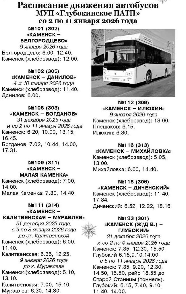 В Каменском районе с 2 по 11 января 2025 года будет сокращено количество общественного транспорта. Об этом сообщила администрация МУП «Глубокинское ПАТП», опубликовав специальное расписание на период новогодних праздников.