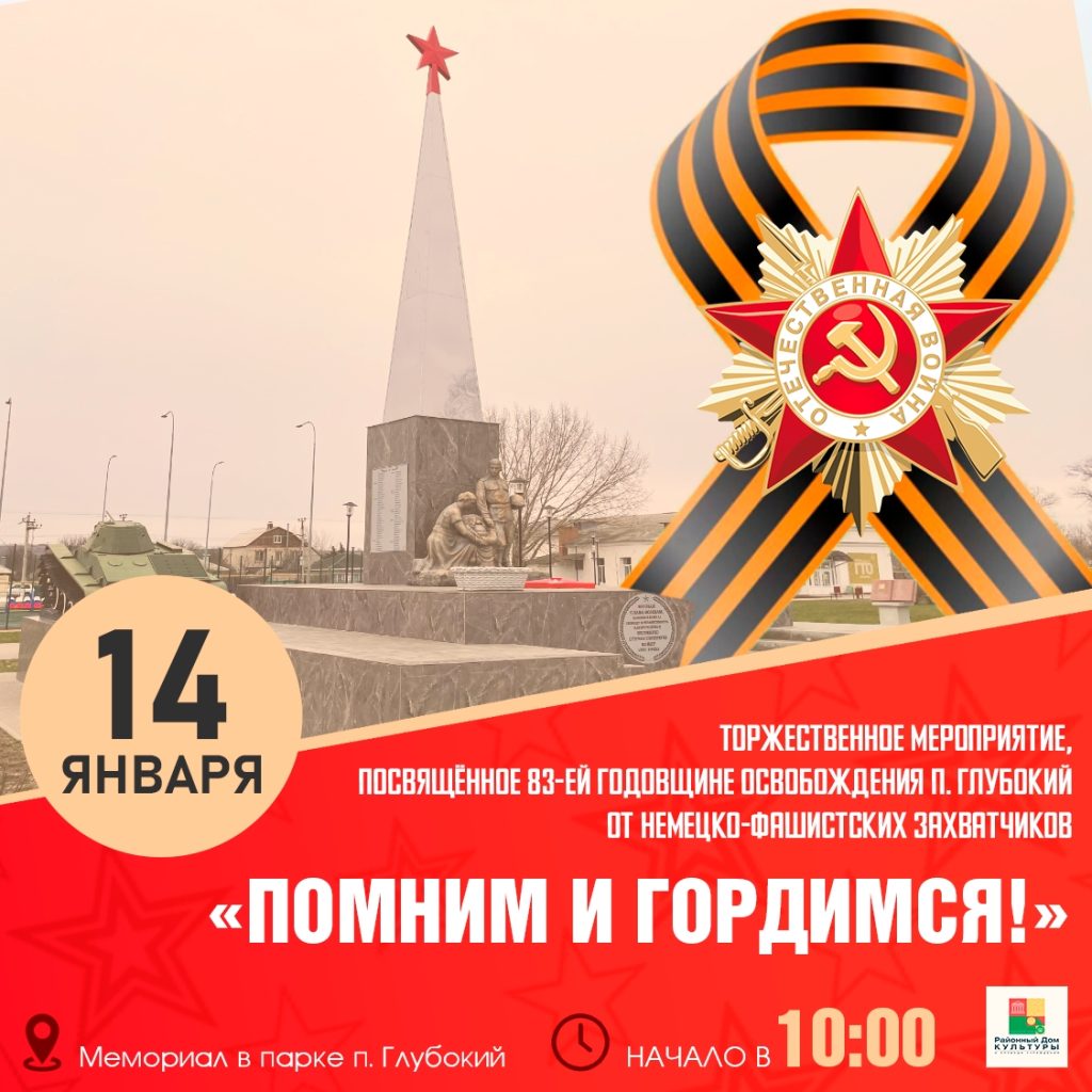 В Каменском районе пройдут памятные мероприятия в честь 83-й годовщины освобождения поселка Глубокого от немецко-фашистских захватчиков, сообщает районный Дом культуры.