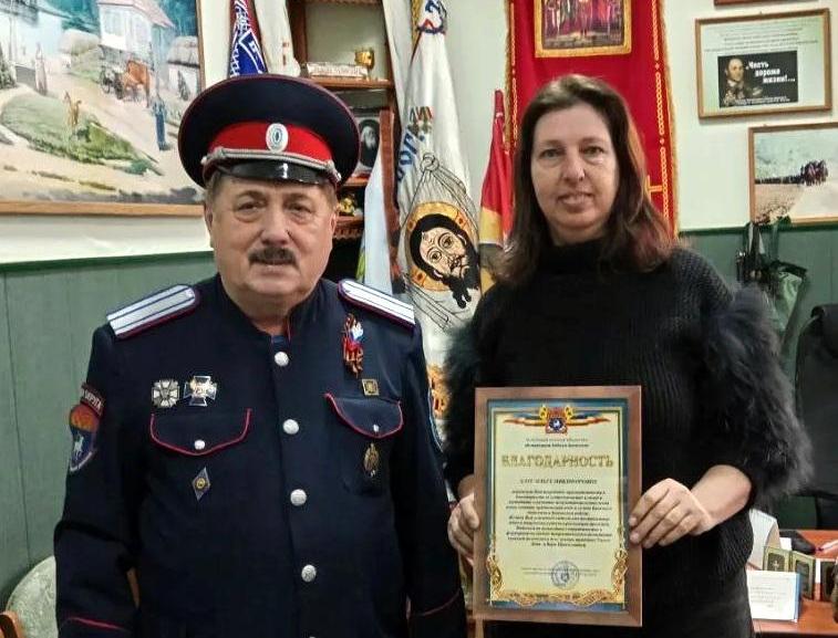 Заведующая Плетняковским отделом Ольга Никифоровна Хлус была отмечена благодарностью атамана Окружного казачьего общества Донецкого округа ВКО ВВД казачьего полковника А.Н. Сидакова. Награда вручена за вклад в воспитание молодежи и продвижение казачьих традиций в Каменском районе.