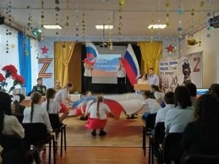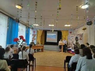 В зале собрались школьники и учителя. Главными героями встречи стали те, кто с оружием в руках защищает наше будущее: ветеран боевых действий в зоне проведения СВО подполковник Жан Вагин и участник СВО гвардии рядовой Дмитрий Цветков. Также на встрече присутствовала заведующая отделом образования Оксана Кандалова.