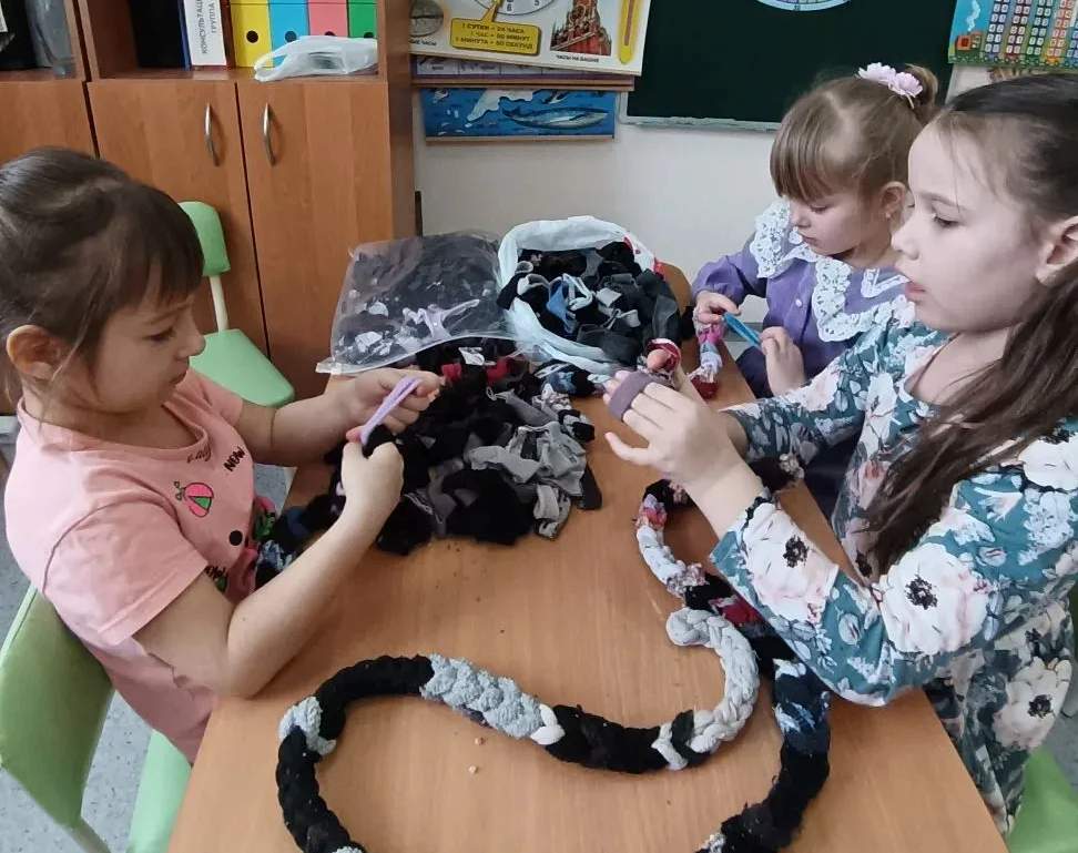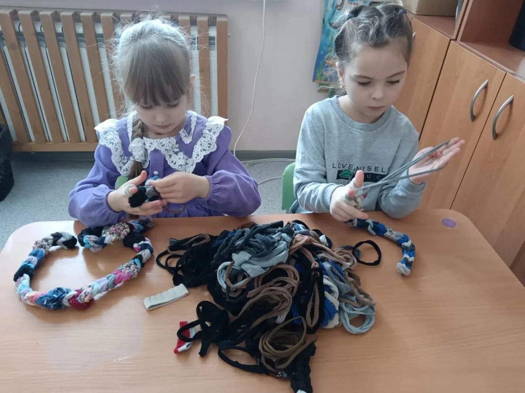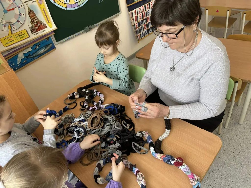 Маленькие пальчики, с любовью и усердием, осваивают необычную технику плетения из разноцветных лоскутков ткани. Из старой одежды и ненужных вещей рождаются теплые, мягкие коврики. Для бойцов на передовой они станут не просто полезной вещью, но настоящим островком комфорта и уюта в блиндажах. На них можно сидеть, отдыхать – это хоть немного сгладит суровые полевые условия.