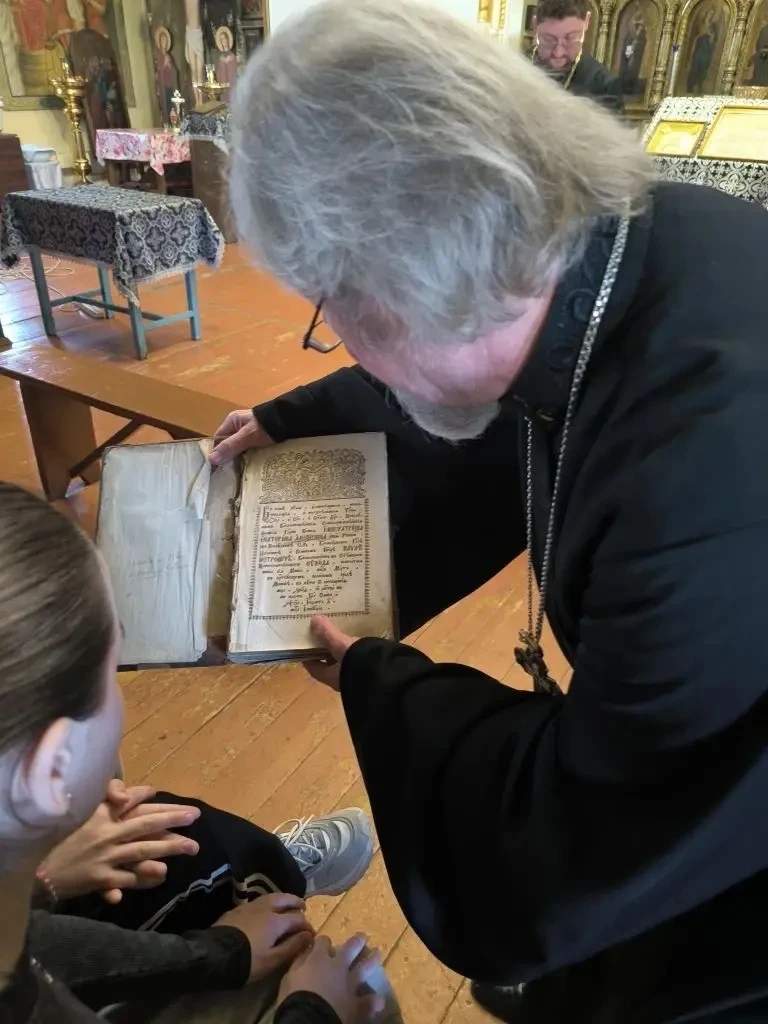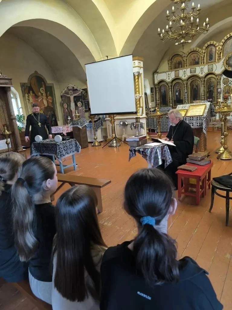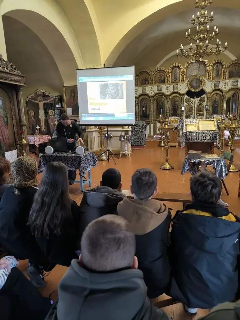 Отец Анатолий подготовил не только выставку православных книг, среди которых были старинные издания, но и тематический видеофильм. Ребята узнали много интересного о первых печатных книгах на Руси, развитии печатного дела и истории православной книги. Настоятель показал школьникам множество изданий – и старинных, и современных. В их числе богослужебные книги, Библия, Закон Божий, Жития святых и художественная литература. Отец Анатолий рассказал, для чего применяется та или иная книга в богослужении.