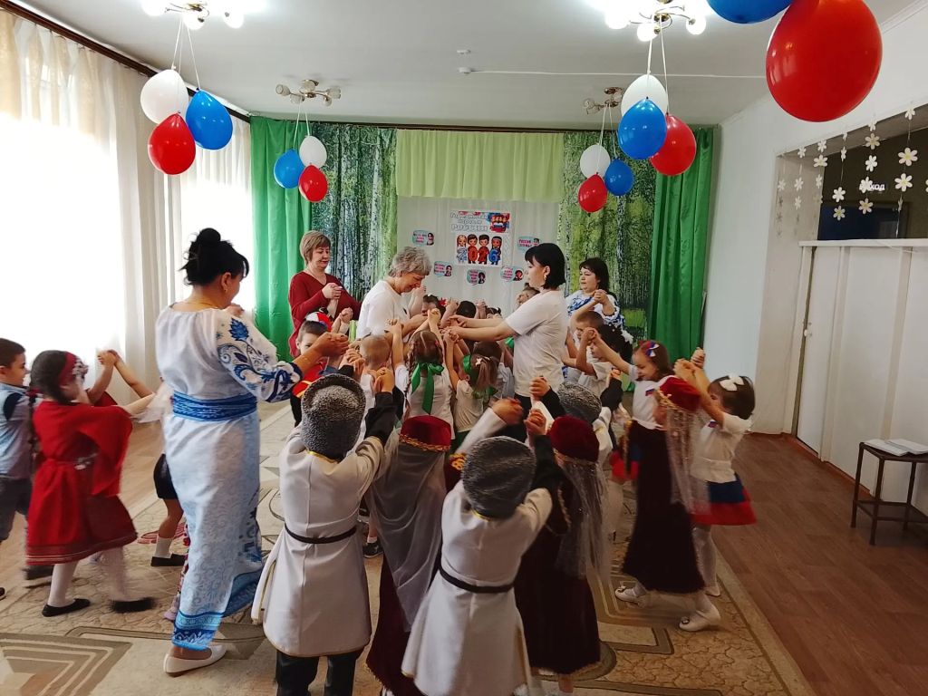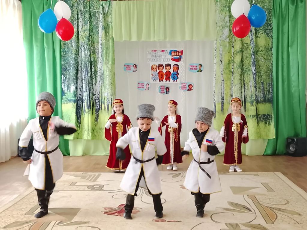 Сцена детского сада в этот день превратилась в яркий калейдоскоп культур. Воспитанники кавказских национальностей покорили зрителей зажигательной лезгинкой, малыши из группы «Чебурашка» исполнили нежный танец «Матушка Земля», а старшие группы объединились в энергичном флешмобе «Я, ты, он, она – вместе целая страна!»
