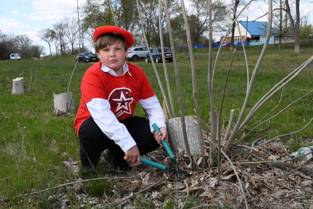 После этого все дружно взялись за инструменты и приступили к работе. Чтобы не было скучно, из динамиков звучали патриотические песни. Солнечная погода, дружная компания и важная работа – все вместе поднимало настроение, работа спорилась. Вокруг мемориала выпололи и убрали траву, прилегающую территорию очистили от сухостоя, вырезали древесную поросль и собрали порубочные остатки.