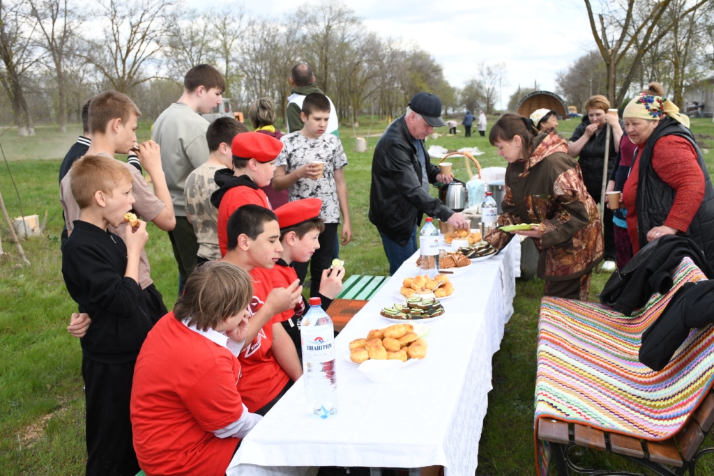В завершение работы дружно сели за стол. Специально для участников акции хуторские хозяюшки напекли пирожки и приготовили горячий чай.