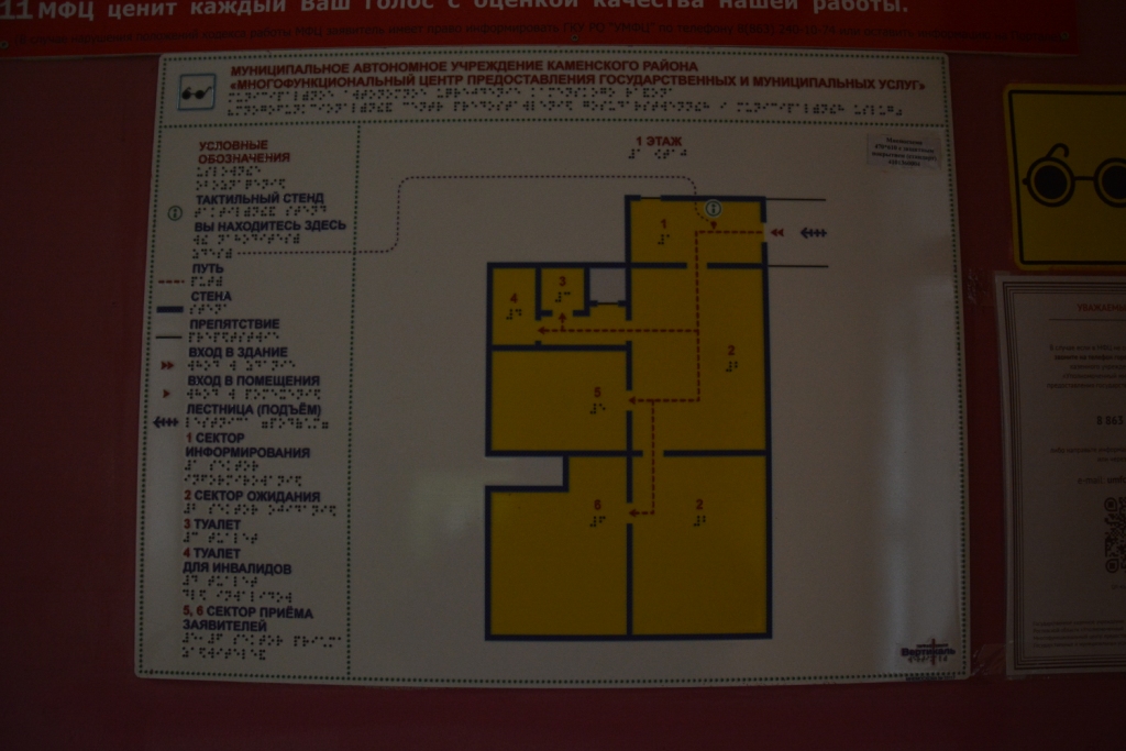 Особого внимания заслуживает мнемосхема, расположенная в тамбуре центрального входа. Это тактильная план-схема первого этажа с выпуклыми элементами, очертаниями стен и путями движения. Все надписи дублируются шрифтом Брайля. Такое решение позволяет человеку с глубокими нарушениями зрения заранее сориентироваться в расположении окон приема, стойки администратора и санитарной комнаты, почувствовать себя увереннее и безопаснее. Как отметили специалисты МФЦ, после установки тактильных указателей и пандуса количество обращений от маломобильных граждан выросло: люди чувствуют себя спокойнее, зная, что их встретят, поддержат и помогут сориентироваться в пространстве.