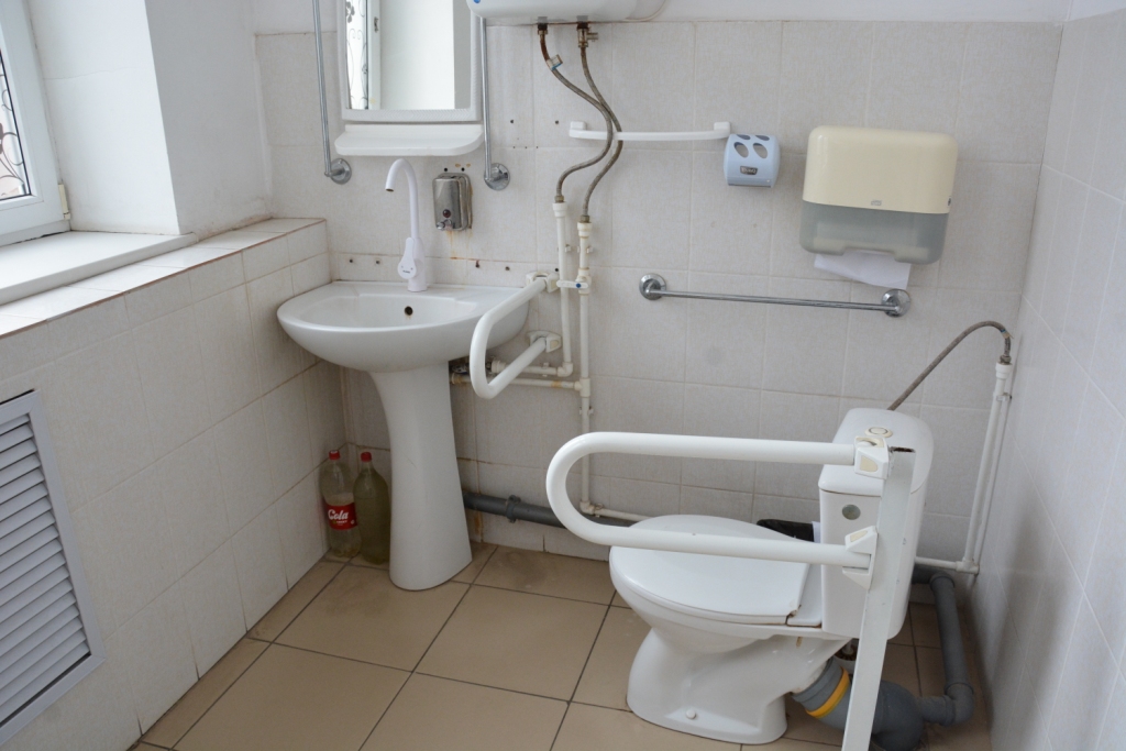 Учтены потребности посетителей и при обустройстве санитарной комнаты. Помещение санузла спроектировано с возможностью разворота коляски. Для дополнительной опоры и удобства здесь установлены поручни: один – стационарный Г-образный на стене, второй – откидной на стойке рядом с сиденьем.